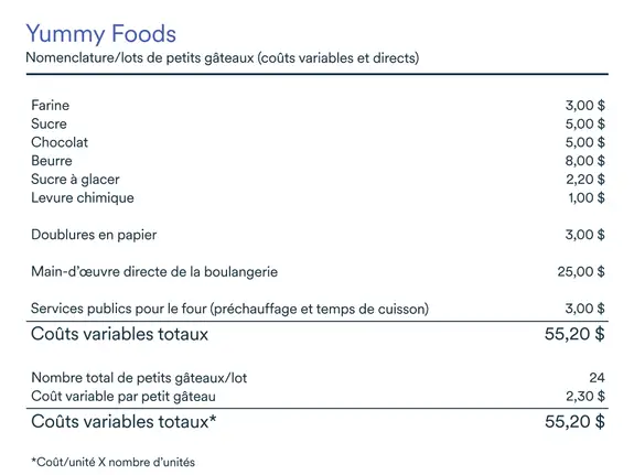Vous trouverez ci-dessous un exemple qui démontre comment calculer le coût variable total ainsi que le coût variable unitaire pour une entreprise fictive de petits gâteaux. Les coûts sont indiqués dans la nomenclature de l’entreprise.