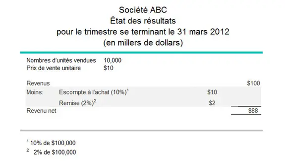L’extrait ci-dessous démontre comment les escomptes et les remises sont déduits des revenus bruts sur l’état des résultats d’une entreprise de vente au détail ou en gros. Dans ce cas, la société ABC vend 10 000 unités de son produit 10 $ chacune, avec un escompte à l’achat de 10 % et une remise de 2 % pour les clientes et clients.