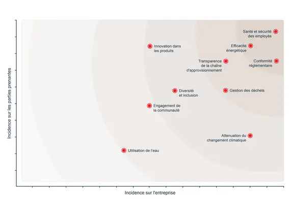 On présente souvent les résultats à l’aide d’un diagramme d’importance relative, à savoir une représentation visuelle des enjeux prioritaires, qui servira de base à la stratégie de l’entreprise en matière de développement durable et aux rapports associés. L’axe des x horizontal représente l’importance relative des enjeux pour une entreprise, alors que l’axe des y vertical représente leur importance relative pour les parties prenantes.
