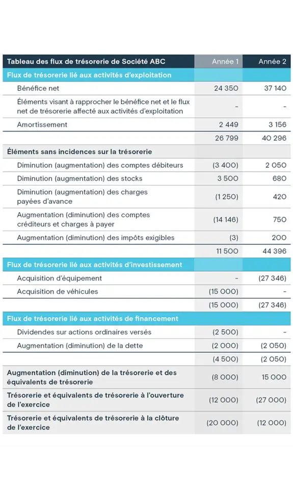 Bien que les flux de trésorerie disponibles ne figurent pas comme un poste dans les états financiers, les chiffres nécessaires pour effectuer le calcul se trouvent dans l’état de l'évolution de la situation financière (parfois appelé «état des flux de trésorerie») et l’état des résultats d’une entreprise. À l’aide de l’exemple de la société ABC ci-dessous, les flux de trésorerie disponibles sont calculés comme suit la première année: