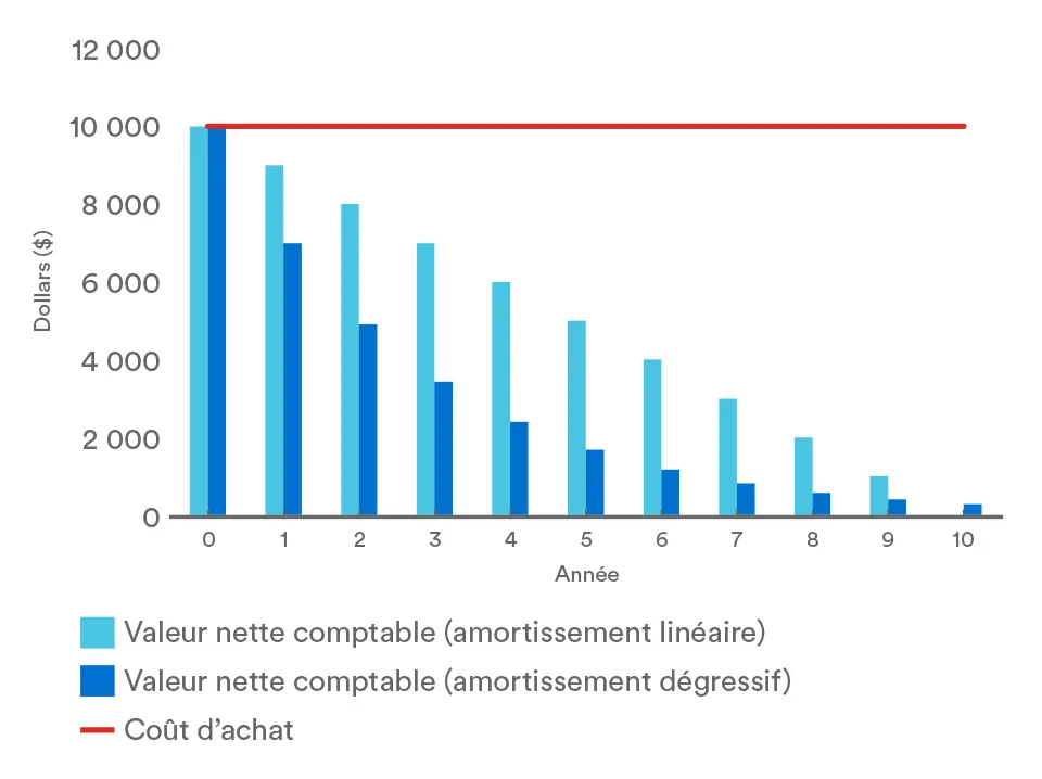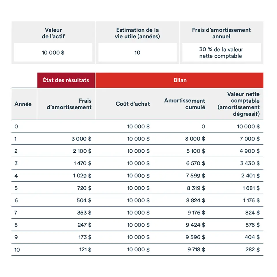 Pour la machine achetée à 10 000 $, si on prend un taux d’amortissement de 30 %, le montant amorti la première année serait 3000 $. Pour la deuxième année, ce serait 30 % de 7000 $, donc 2100 $ et ainsi de suite. Comme les sommes réparties sont plus importantes les premières années suivant l’achat de l’équipement, elles viennent réduire davantage le bénéfice avant impôt de l’entreprise pendant cette période.