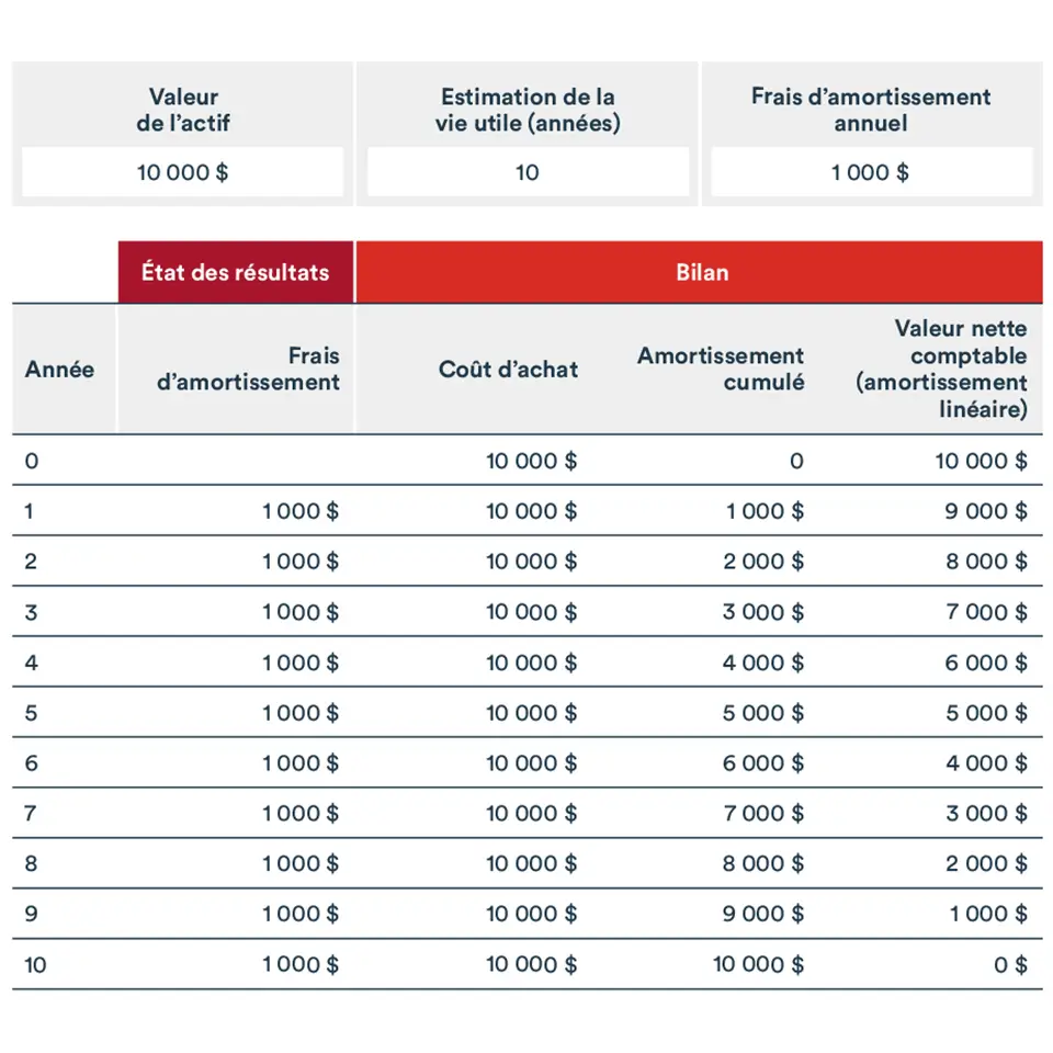 L’actif est amorti au même montant chaque année de sa vie utile. Par exemple, si une machine a un prix d’achat de 10 000 $ et une durée de vie de 10 ans, l’amortissement serait de 1 000 $ par année. Cette méthode permet de maintenir le bénéfice avant impôt de l’entreprise élevé les premières années suivant l’achat de l’équipement.