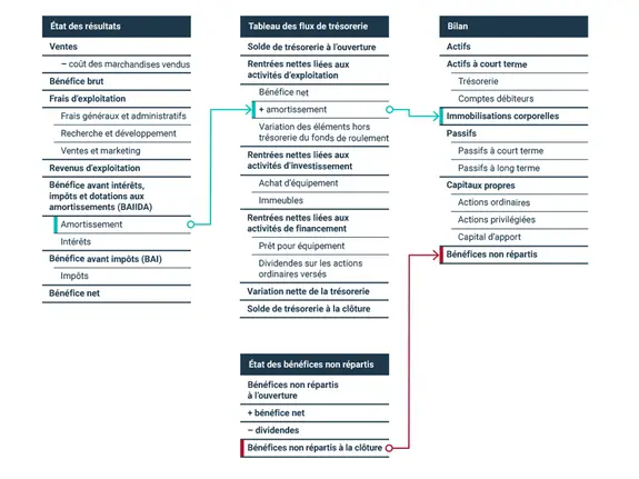La valeur comptable nette de l’actif sera enregistrée sur le bilan, alors que nous retrouverons une charge à l’état des résultats. La charge d’amortissement de l’exercice précédent se retrouvera dans les bénéfices non répartis, aux capitaux propres. Cela continuera ainsi jusqu’à ce que le coût de l’actif soit entièrement amorti ou que l’actif soit vendu ou remplacé. L’image ci-dessous montre les liens entre les différents documents des états financiers.