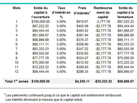 Les prêts plus complexes combinent le paiement d’intérêt plus une partie du montant initial emprunté (le capital) sur une base amortie. Le tableau ci-dessous présente le calendrier de paiement pour un prêt de 100 000 $ à 5 %, avec un amortissement de trois ans:
