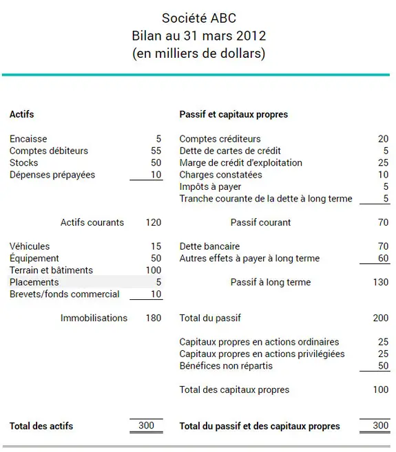 Le bilan ci-dessous montre que la société ABC détient une propriété à long terme dans une autre entreprise sous forme d’un placement de 5 000 $.