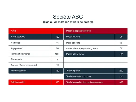 Dans le bilan ci-dessous, la société ABC détient une dette totale de 200 000 $ et des actifs totaux de 300 000 $.
