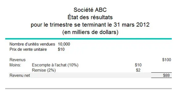 L’extrait ci-dessous démontre comment le revenu net apparaît sur l’état des résultats d’une entreprise de vente au détail ou en gros. Dans ce cas, la société ABC vend 10 000 unités de son produit à 10 $ chacune, avec un escompte à l’achat de 10 % et une remise de 2 % pour la clientèle.