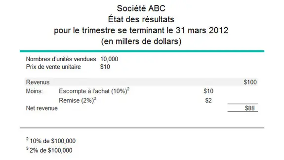 L’extrait ci-dessous démontre comment on calcule le revenu brut et comment l’influencent les escomptes et les remises sur achats. Dans ce cas, la société ABC vend 10 000 unités de son produit à 10 $ chacune, avec un escompte à l’achat de 10 % et une remise de 2 % pour la clientèle.