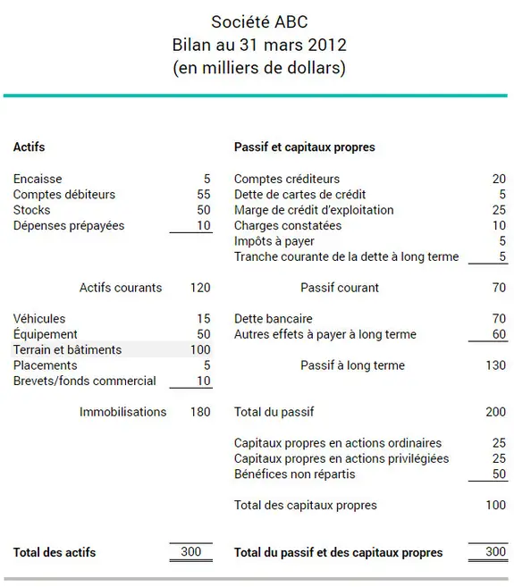 Lorsqu’une entreprise achète des terrains et des constructions, le coût total s’ajoute au bilan. Comme la valeur d’une construction diminue à l’utilisation, son coût est amorti (répartis sur plusieurs années) plutôt que traitée comme dépense ponctuelle. Cet amortissement figure dans l’état des résultats et se fait seulement pour les constructions. En général, on n’amortit pas les terrains parce qu’ils sont censés maintenir leur valeur.