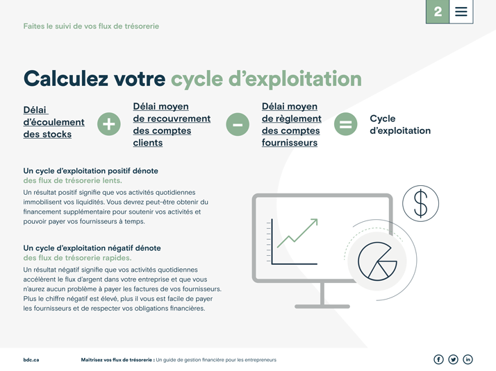 Découvrez des façons de gérer les flux de trésorerie de votre entreprise. Apprenez comment la prévision des ventes et des stocks, tout comme la réduction du délai de paiement de vos clientes et clients, peuvent améliorer votre cycle d’exploitation.