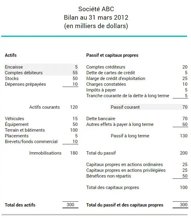 Les actifs à court terme sont inscrits au bilan du plus liquide au moins liquide. L’encaisse, par exemple, est plus liquide que les stocks. Dans l’exemple ci-dessous, la société ABC a 120 000 $ d’actifs à court terme et 70 000 $ de passif à court terme.