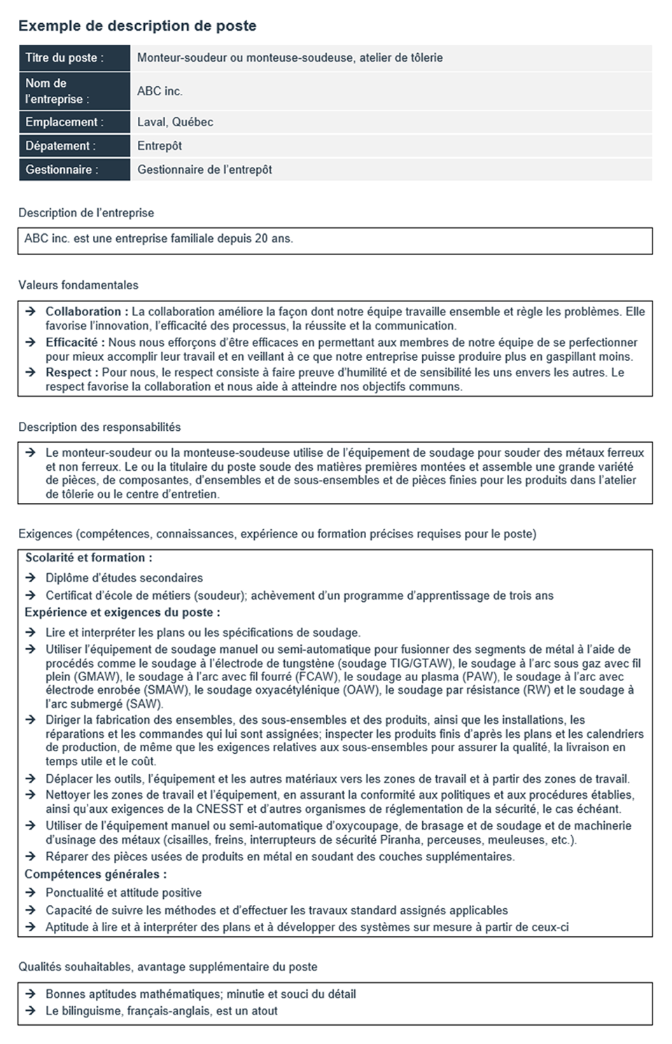 L’exemple suivant a été créé à l’aide de la ressource gratuite Modèle de description de poste de BDC