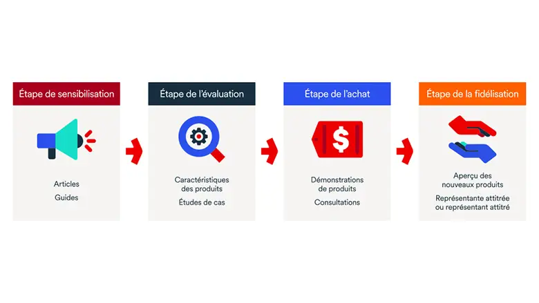 Des clientes et clients potentiels qui ne sont pas encore prêts à acheter aux clientes et clients qui ont déjà effectué plusieurs achats, chaque segment a des besoins précis. La ou le propriétaire d’entreprise doit y prêter attention et fournir des renseignements précieux au bon moment afin d’instaurer un climat de confiance et d’établir de bonnes relations.