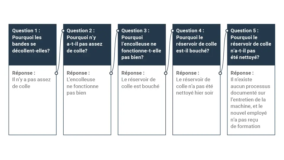 1. Cerner les contraintes: Utilisez la schématisation des processus pour visualiser votre système et déterminer les endroits où il y a un retard. Déterminez ensuite les causes du retard. Vous pouvez utiliser des outils comme l’approche des « cinq pourquoi », qui consiste à se demander « pourquoi » quelque chose se produit plusieurs fois, ou un diagramme en arêtes de poisson.