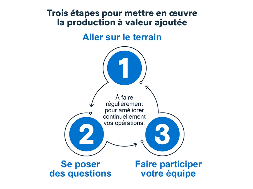La production à valeur ajoutée est axée sur la réduction du gaspillage, c’est-à-dire des activités sans valeur ajoutée dans une entreprise. Elle est souvent associée à l’industrie manufacturière, mais peut être utilisée dans tout type d’entreprise. La production à valeur ajoutée comporte trois étapes pour éliminer le gaspillage.