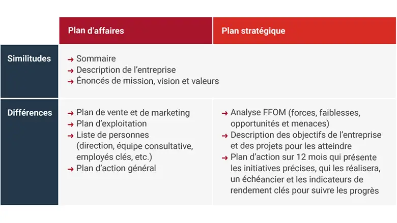 En d'autres termes, le plan d’affaires décrit les activités actuelles ou un nouveau projet précis. Le plan stratégique porte sur la façon dont vous voulez modifier votre entreprise pour qu’elle se développe ou pour qu’elle soit prête pour l’avenir.